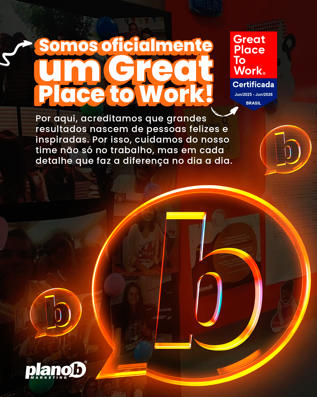 Na prática, o selo GPTW reforça que a PlanoB não é apenas um local de trabalho, mas também de crescimento humano e profissional. É onde talentos se encontram, ideias ganham vida e pessoas se sentem parte de algo maior.